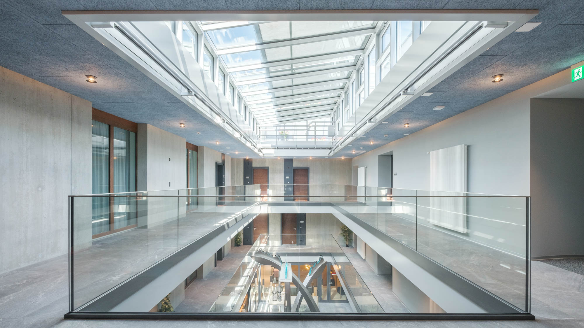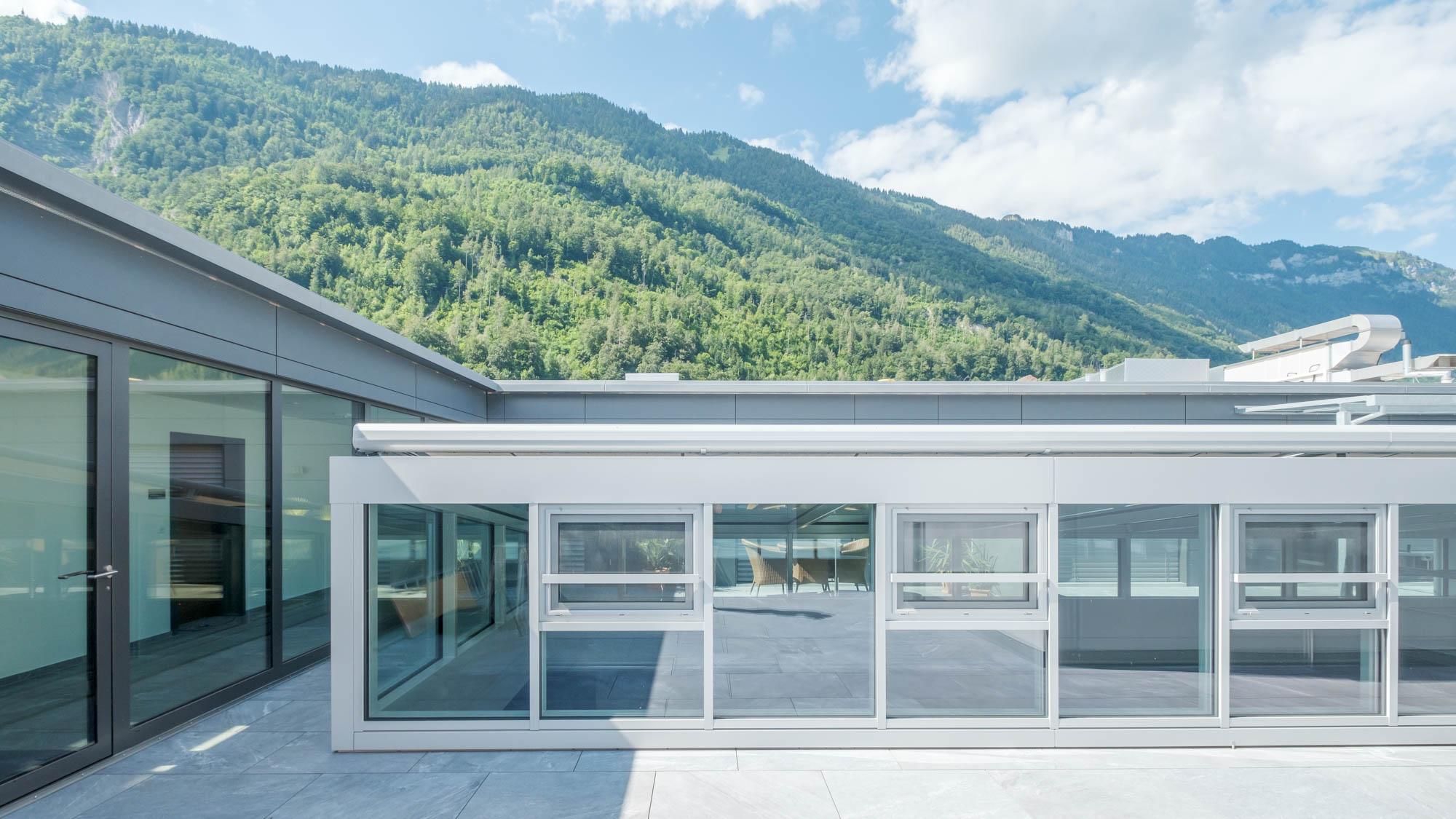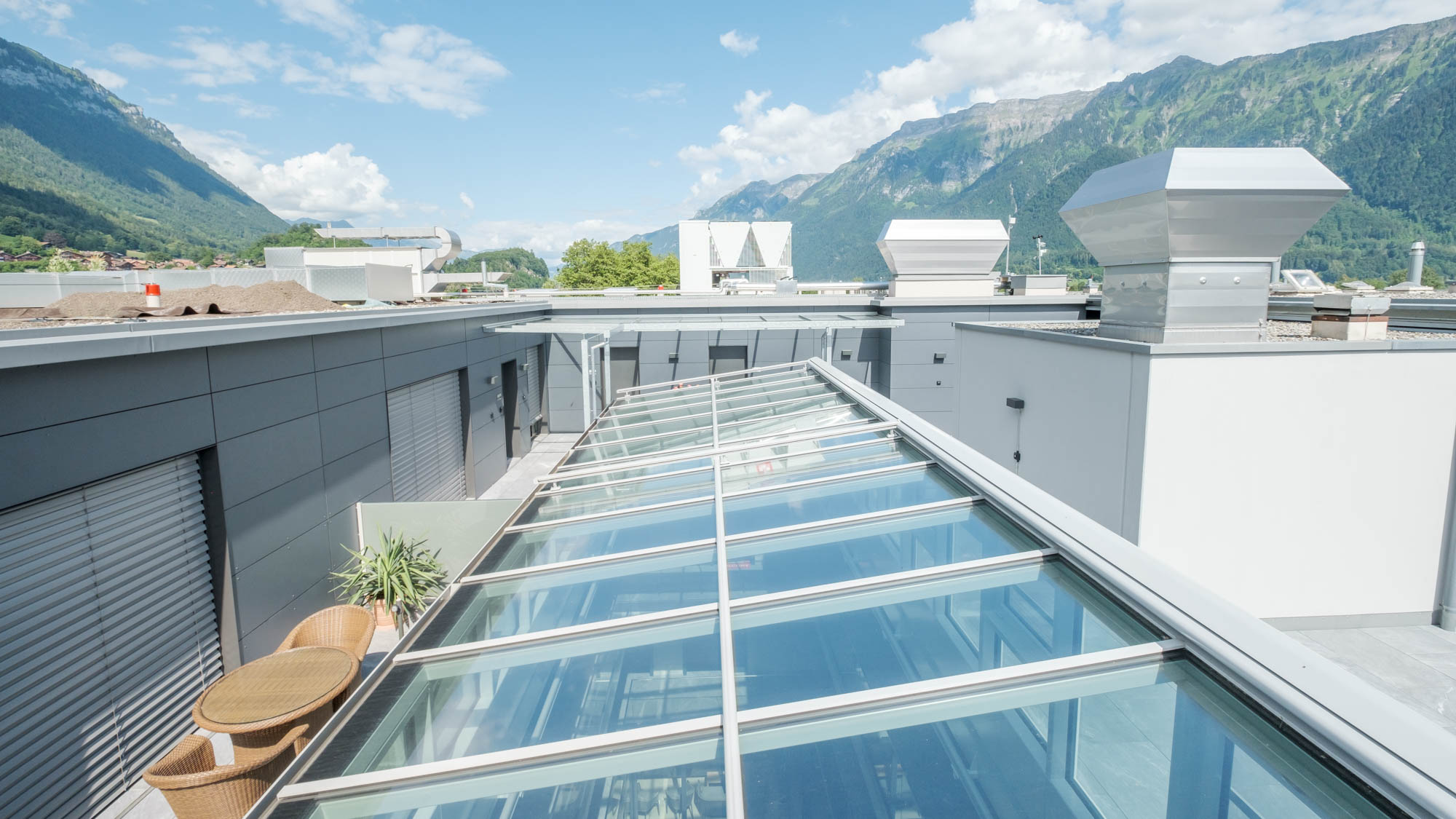 Der Lichthof des Jungfraucenters Interlaken wird geschützt von unserer Dachverglasung, gefertigt aus Forster thermfix light Profilen. Dank den schlanken Profilen fliesst viel angenehmes Licht in das Gebäude, und trotzdem ist es optimal thermisch isoliert.