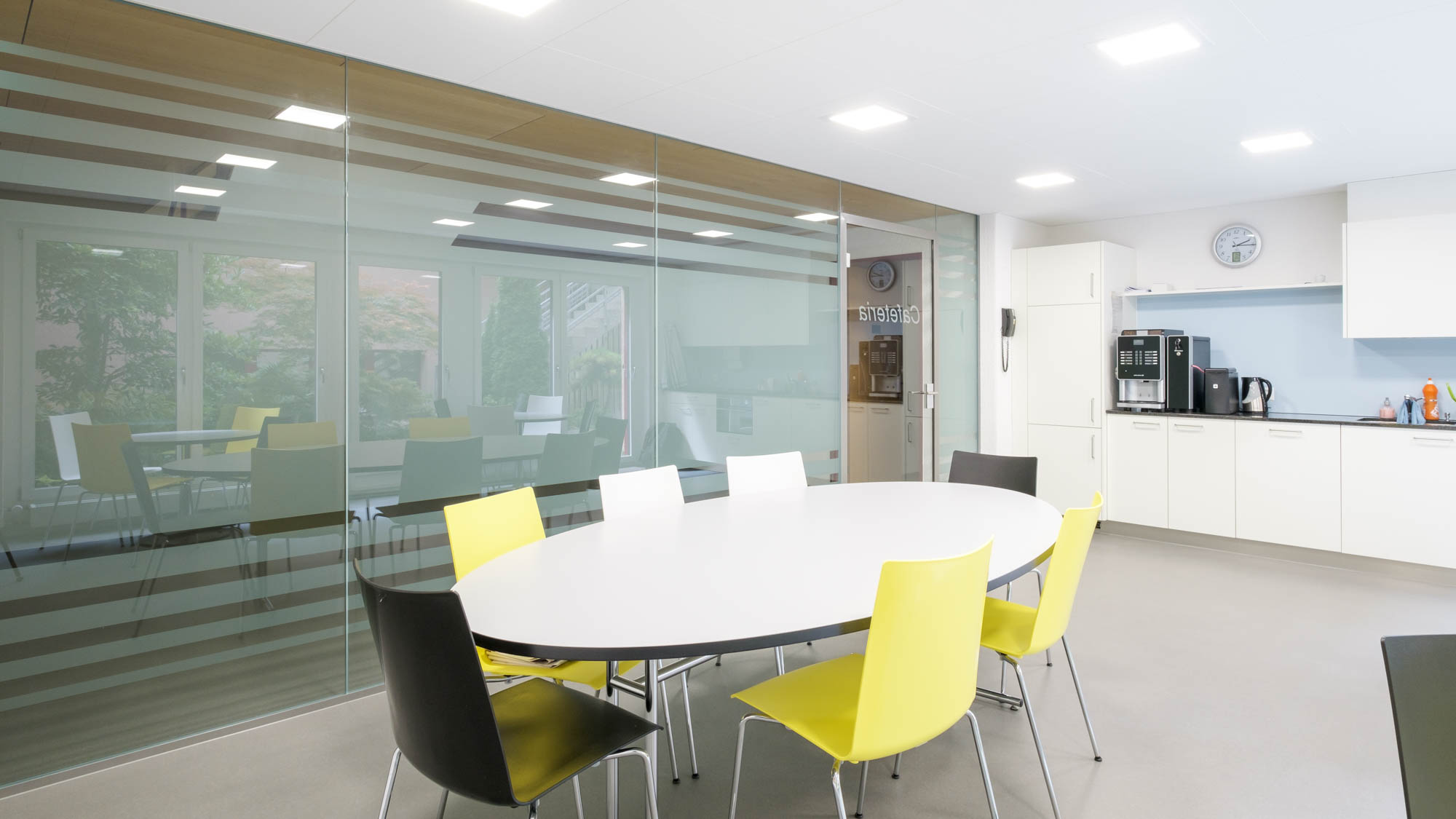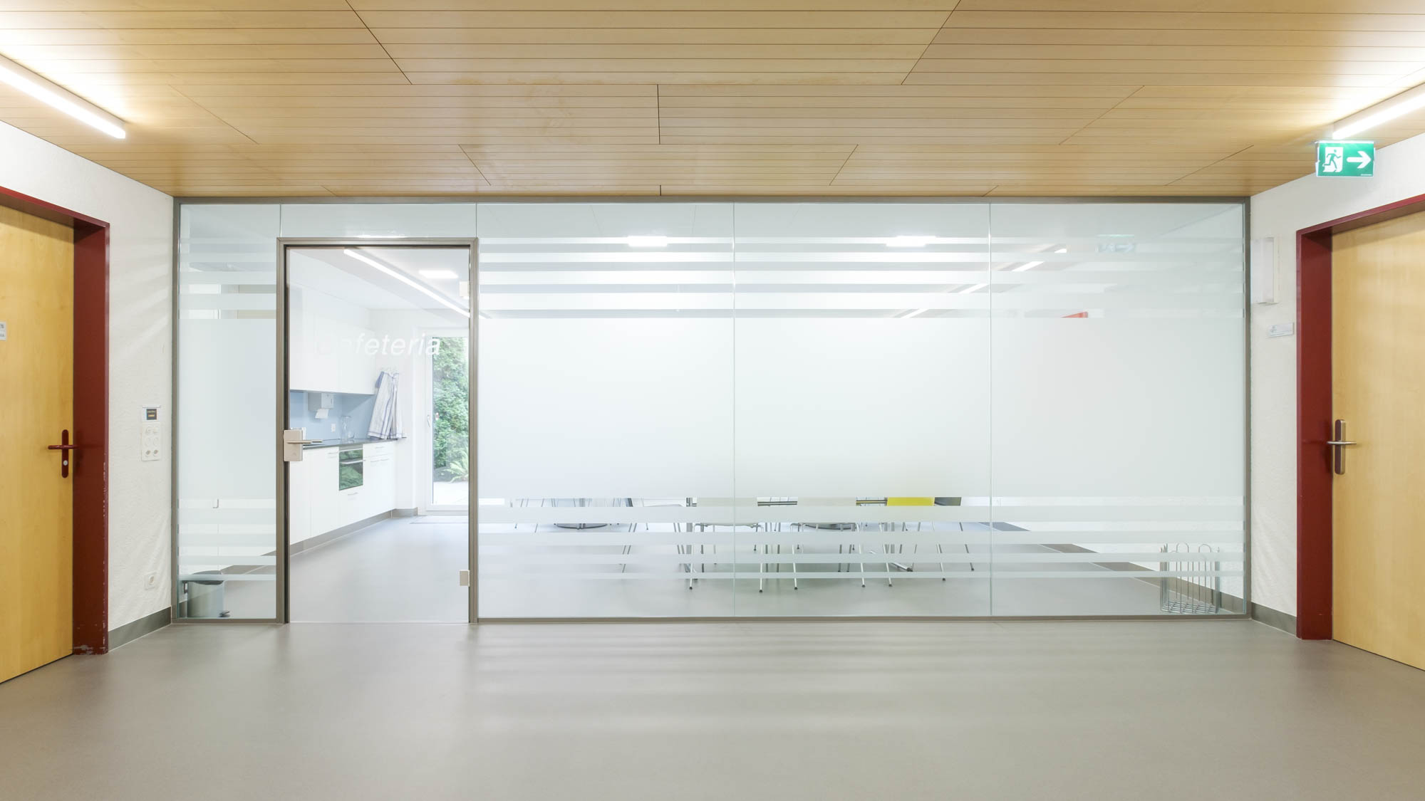 Die neue Glaswand trennt die Cafeteria vom Treppenhaus ab. Mit den starken Verbundgläsern aus 2 x 8 mm Glas, und der Abdichtung zwischen den Gläsern liess sich eine gute Schalldämmung erzielen. Die Cristal – Folien wurden nachträglich auf die Glaser montiert, um einen gewissen Sichtschutz zu erreichen, ohne zu verhindern, dass allzu viel Licht absorbiert wurde. Auch die Türe aus ESG hat dreiseitig eine Gummidichtung.