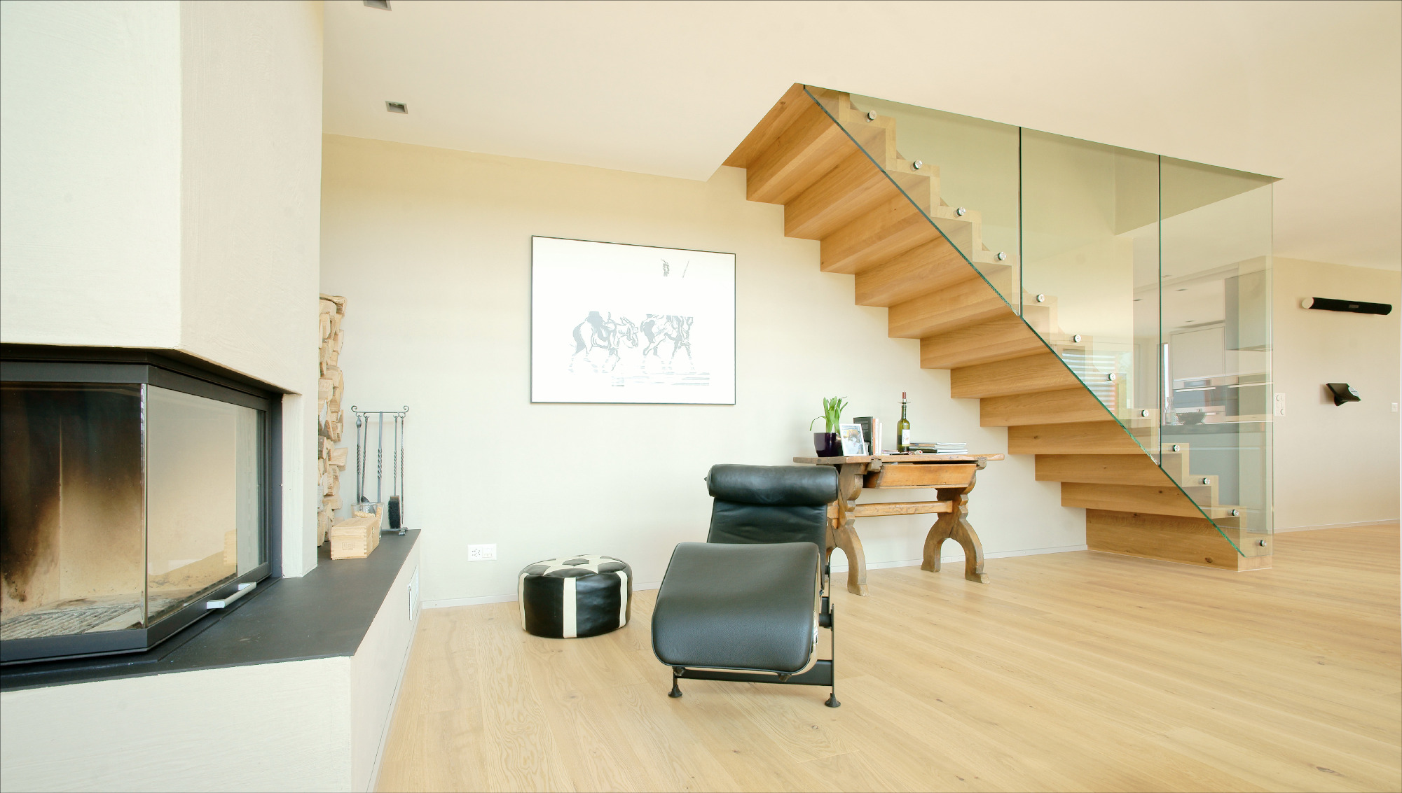 | Besonderheit | Die Geländergläser laufen ins obere Stockwerk und bilden dort zugleich das Rücklaufgeländer |