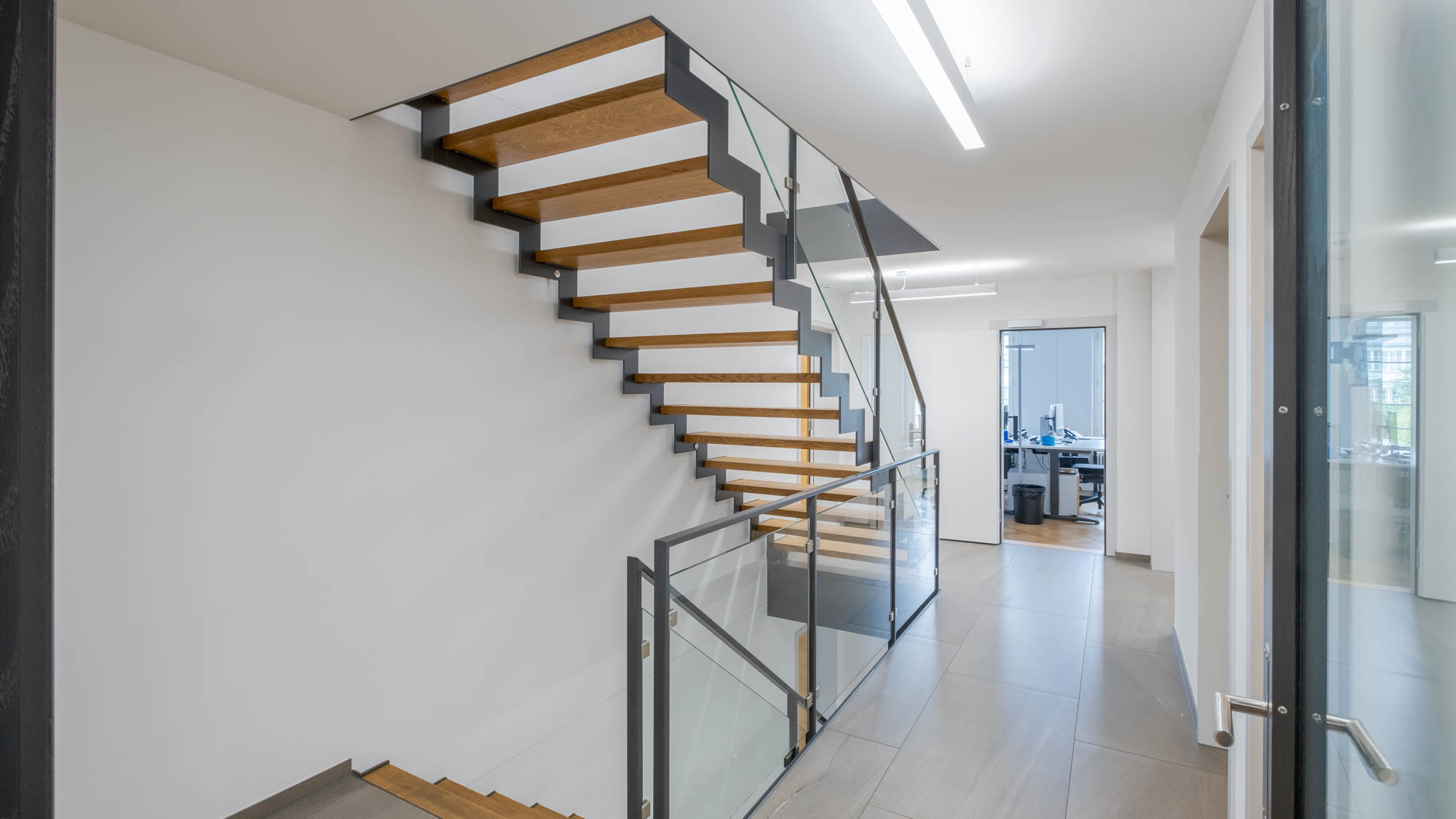 Auch Büroräume dürfen etwas wohnliches haben. Die Z-Holmtreppen sind pulverbeschichtet und haben angenehme, geölte Eichentritte. Das Geländer ist transparent, das Rechteckrohr als Handlauf liegt angenehm in der Hand.