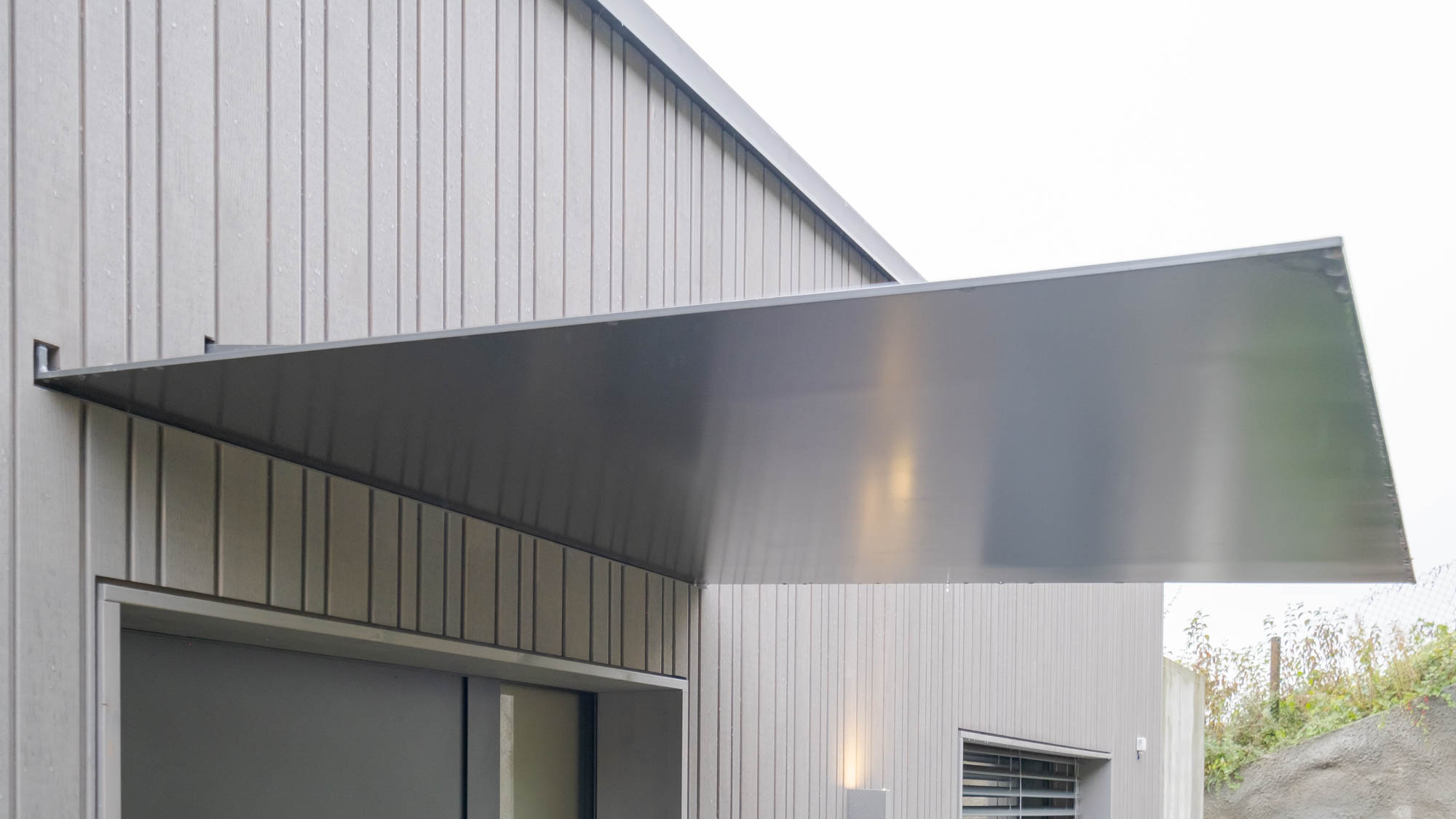Das Vordach besteht aus einer massiven 8 mm dicken Stahlplatte. Um dem Wetter zu trotzen wurde das Dach feuerverzinkt und pulverbeschichtet. Montiert ist das Vordach auf Dosteba – Blöcke, die den Stahl thermisch vom Gebäudekörper trennen, und das Dach doch sicher halten.