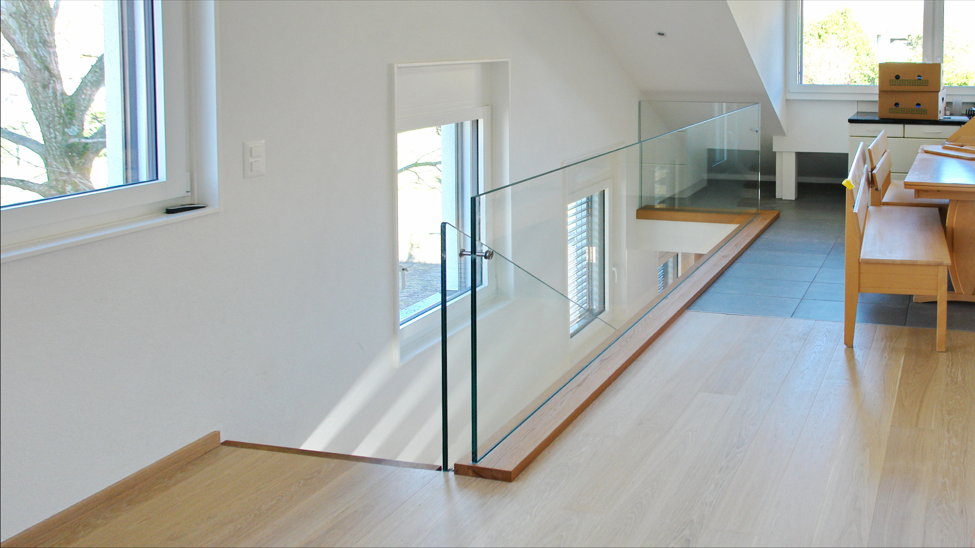Sie kann keinem Besucher entgehen, der das Haus betritt - die Glastreppe mit Eichenstufen. Die grosse Glasfläche bringt Geländer, Statik und Transparenz in einem. Darum arbeitet die zeitgenössische Architektur so gerne mit dem Werkstoff Glas. Obwohl die Tritte förmlich fliegen, fühlt sich sehr sicher, wer die Treppe begeht. Damit erfüllt die Glastreppe widersprüchliche Anforderungen sehr ansprechend.
