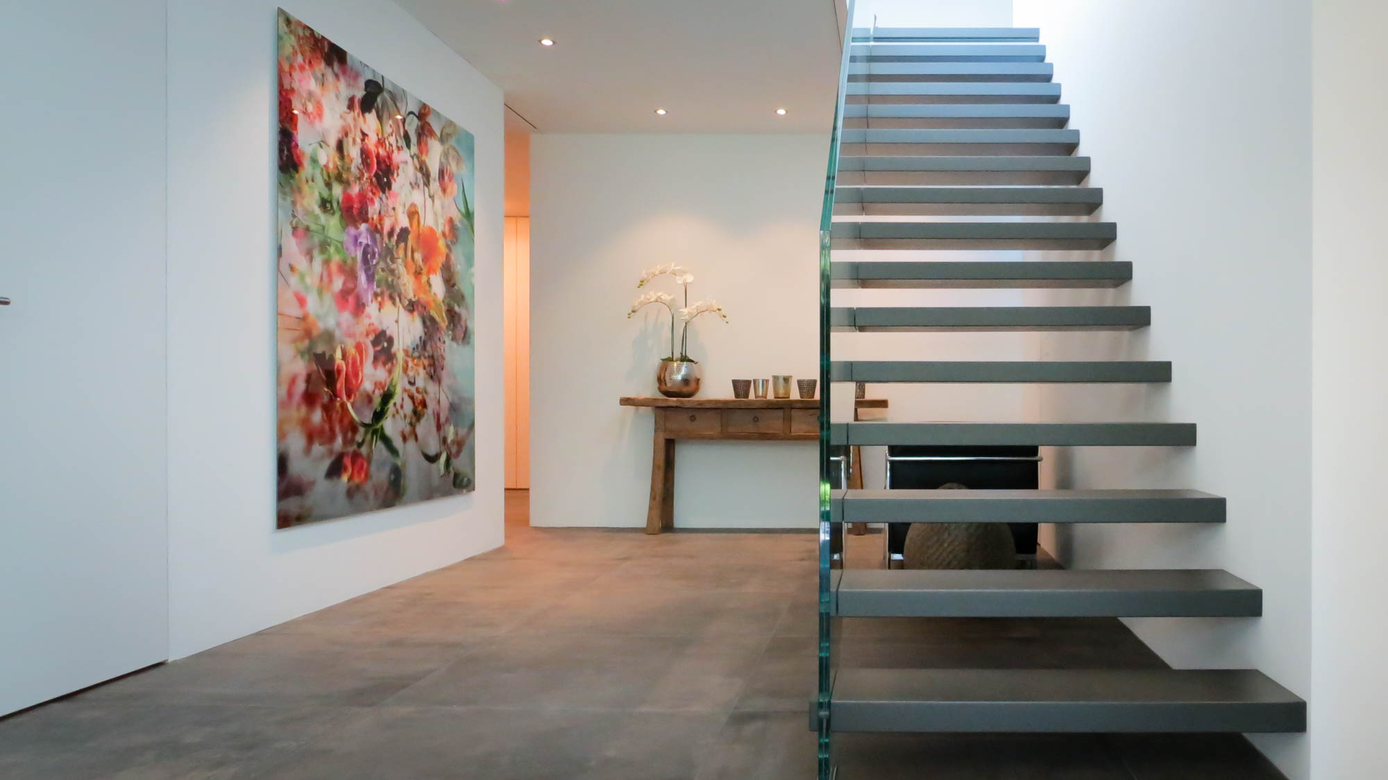 Glaswangentreppe mit deckend lackierten Holzstufen. Die Stufen sind unsichtbar in der Wand befestigt. Die Glaswange trägt die Stufen und macht eine einfache, schalldämmende Befestigung in die Wand möglich.