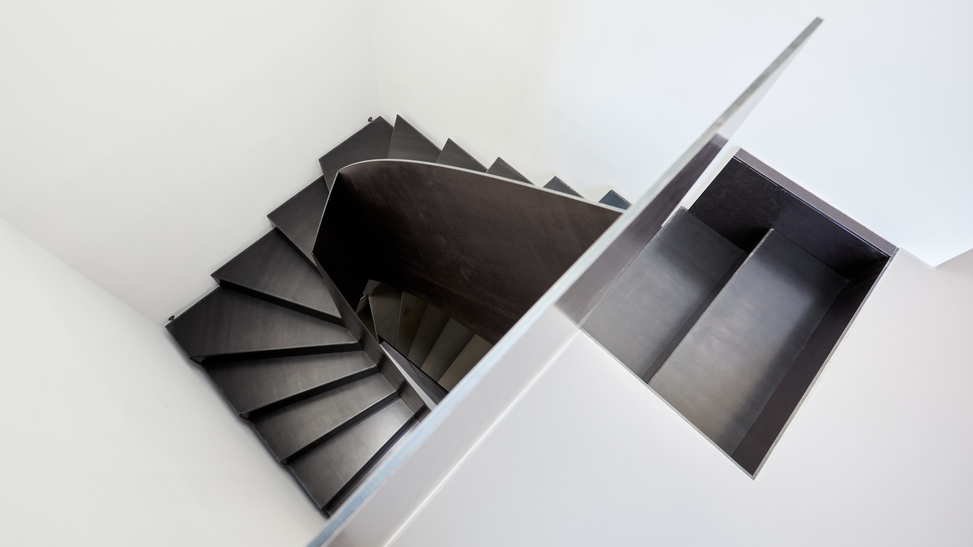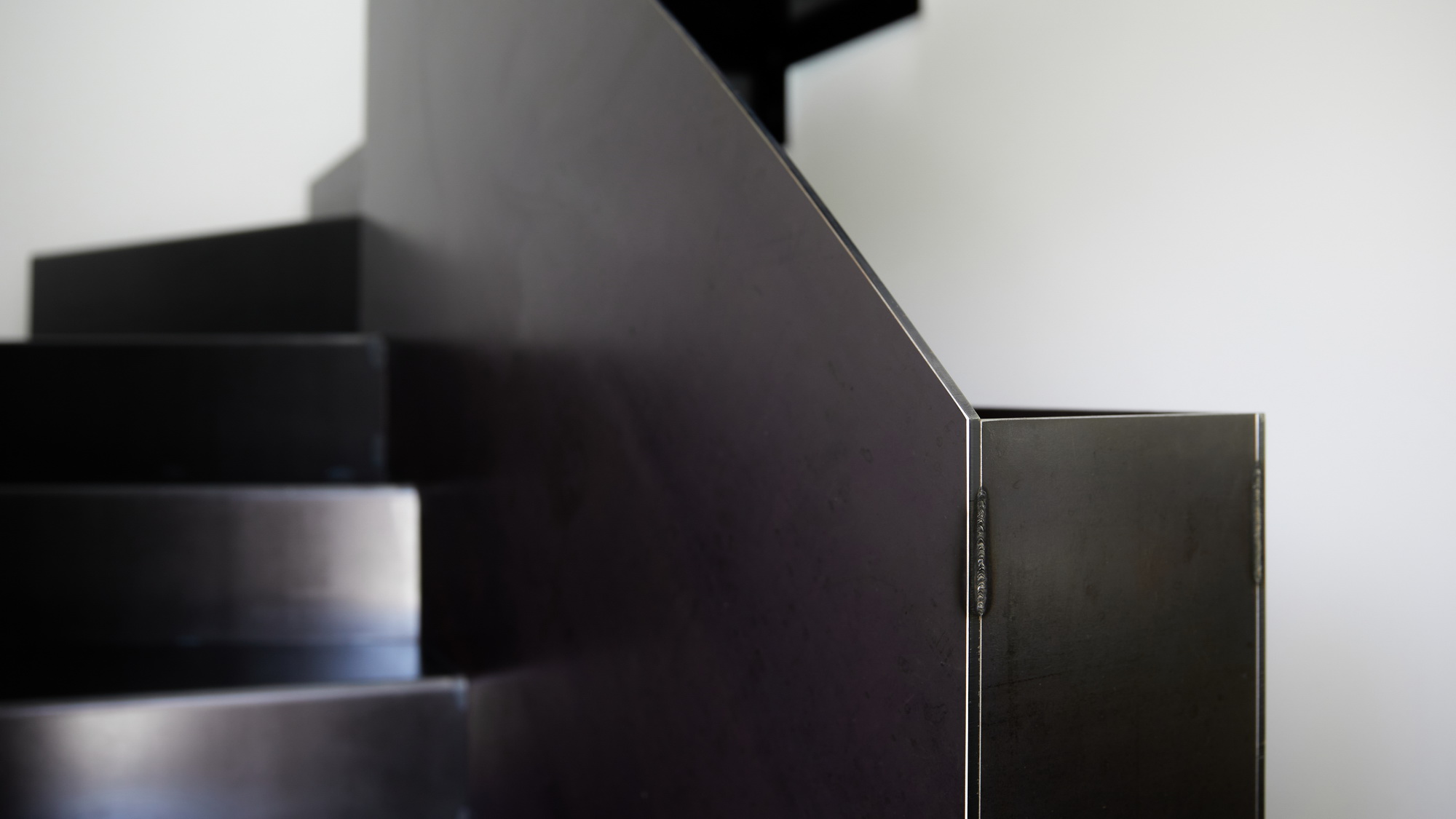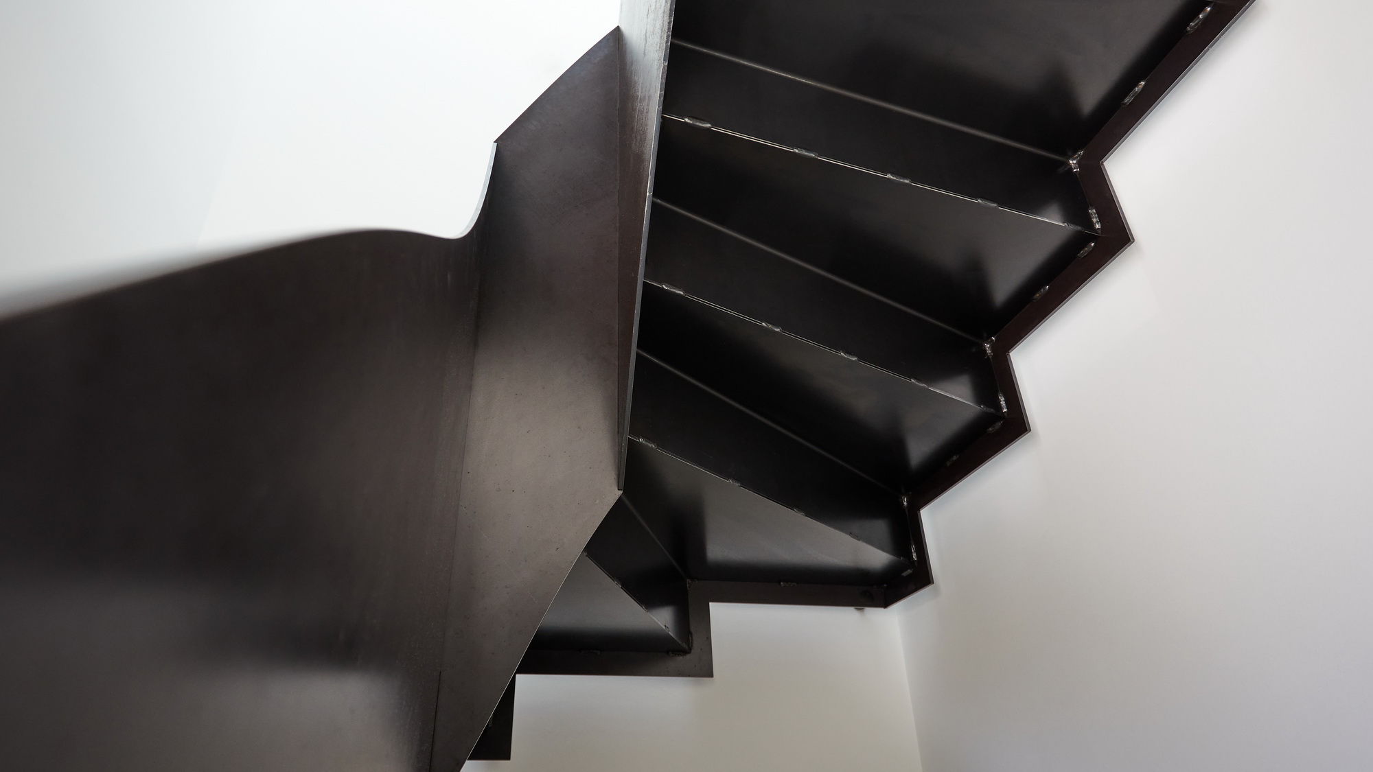Bei dem Einfamilienhaus wurde das Obergeschoss komplett abgebrochen, und mit einem Elementbau ersetzt. Neu führt eine Faltwerktreppe aus rohem Stahl in das Obergeschoss. Zu sehen ist Leistung zweier Handwerke, die der Treppenbauer und des Fotografen.