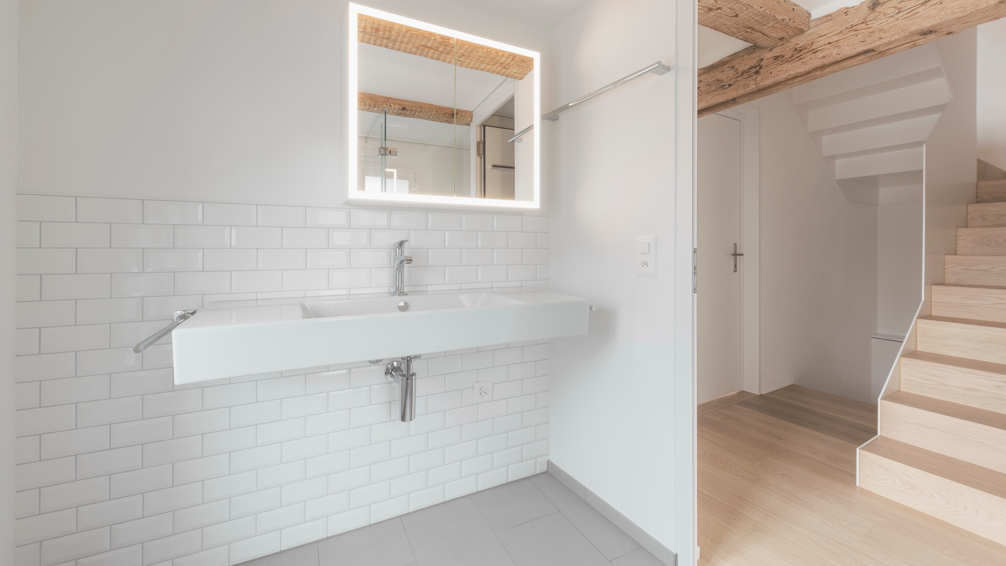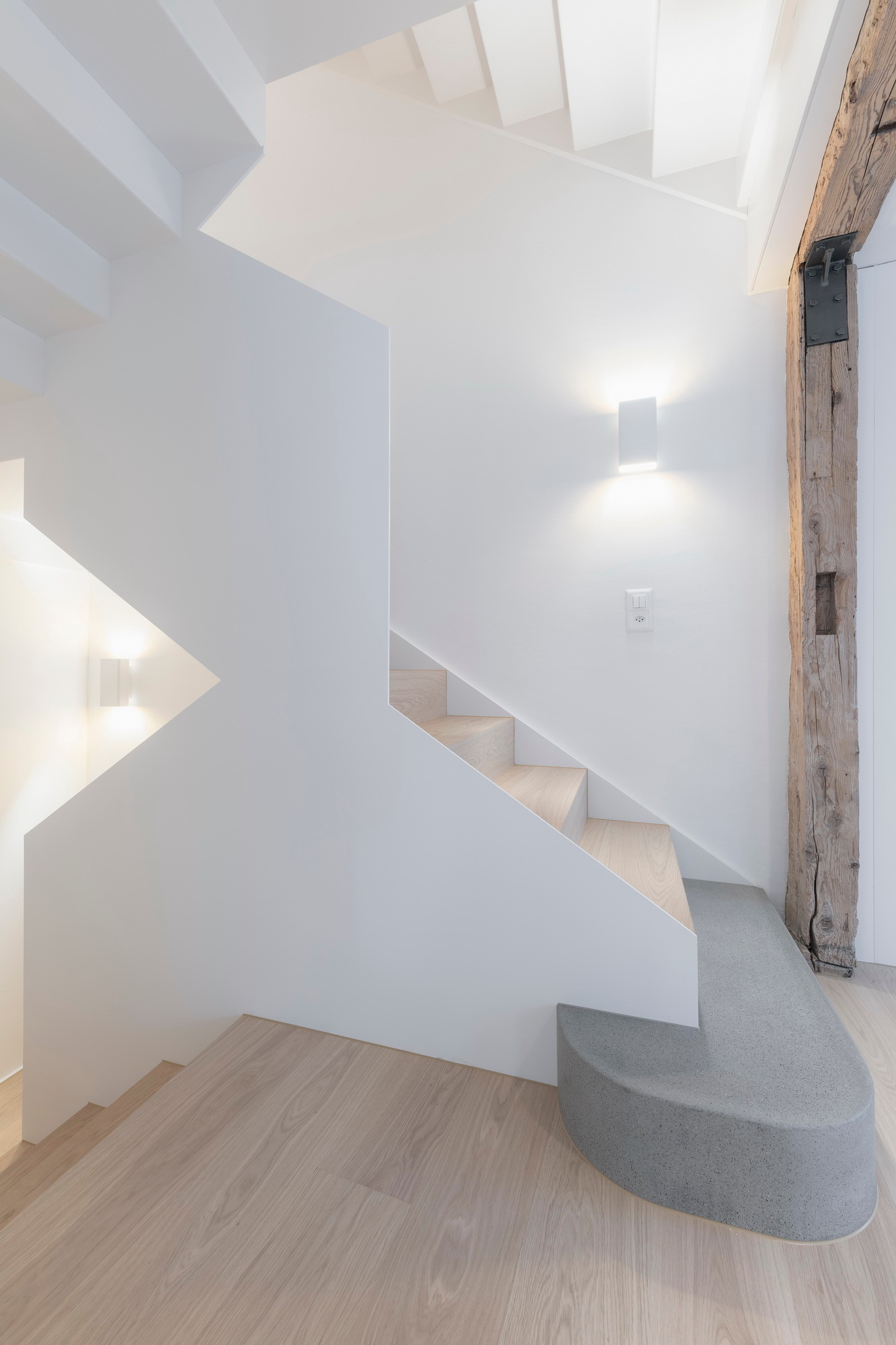 Die Faltwerktreppe erschliesst vier Stockwerke in dem alten Stadthaus. Um den Platz optimal zu nutzen, wurde im Treppenauge eine einzige Wange verwendet, die abwechslungsweise für jede Treppe das Geländer bildet.