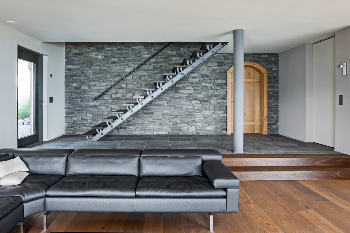 Beim Durchschweifen des Raumes sticht sie ins Auge – die Zweiholmentreppe mit Parkettstufen. Das Parkett ist gebürstet und mit Rohöl behandelt. Die Oberfläche des Metalls ist pulverbeschichtet. Im Gesamtbild wirkt die Treppe modern und verleiht dem Raum Kontinuität. Entlang der antiken Steinmauer und über die denkmalgeschützte Türe hinweg ist das Konstrukt eine Besonderheit. Moderne trifft Antike!