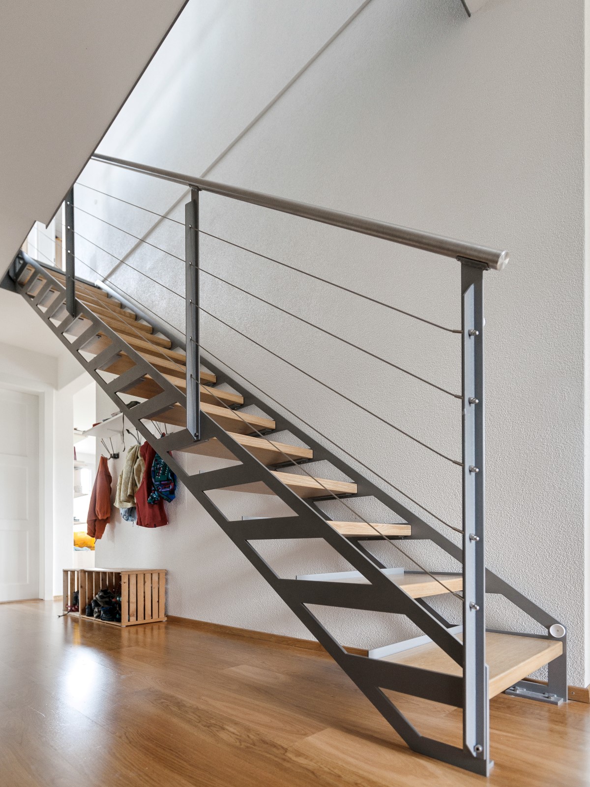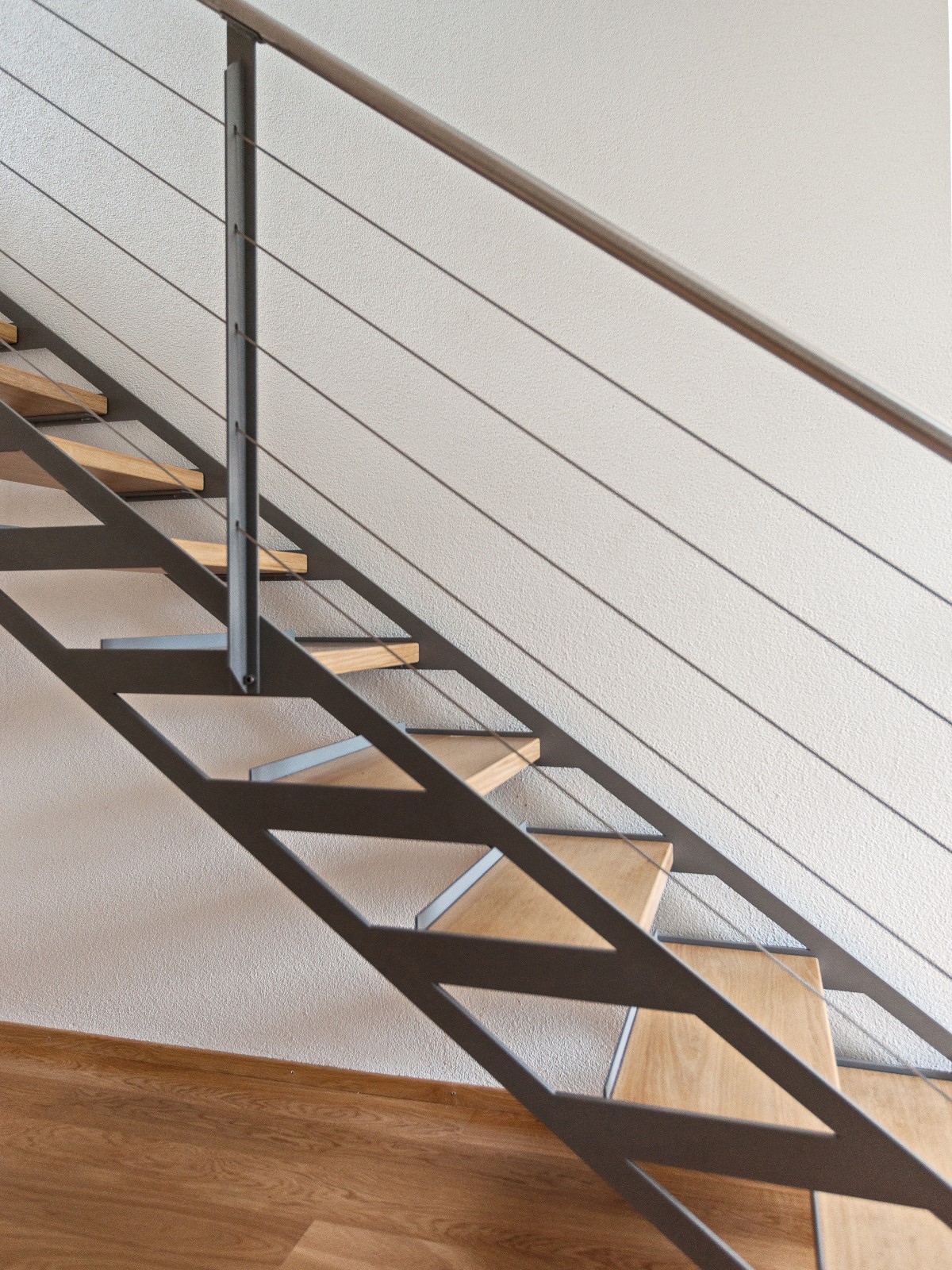 Leichter als diese Treppe kann eine Wangentreppe kaum noch wirken. Die Ausschnitte in der Wange geben der Treppe Transparenz, und etwas verspieltes. Mit dem Flachstahl an der Rückseite des Tritts wird der Abstand zwischen den Tritten unter 120 mm gehalten, und erfüllt damit die bfu-Richtlinien.