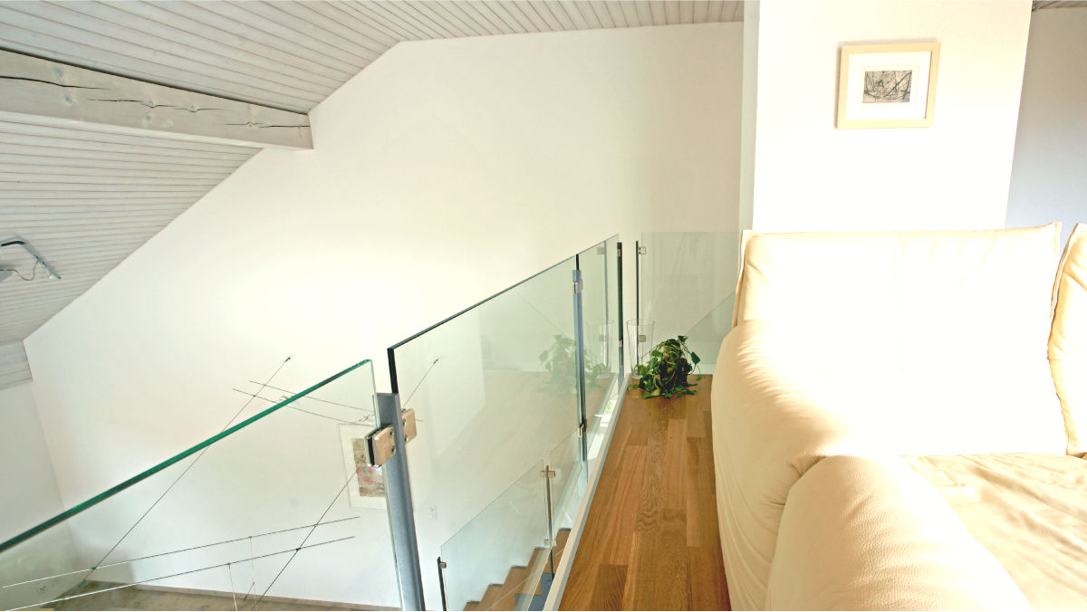 Die hell gedämpften Buchentritte sind zwischen die Wangen geschraubt. Die dezenten Farben tragen dazu bei, dass die Treppe den Raum nicht erdrückt. Das schlichte Geländer mit Klarglaselementen  ohne Handlauf konkurrenziert die Treppe in ihrer Form in keiner Weise.