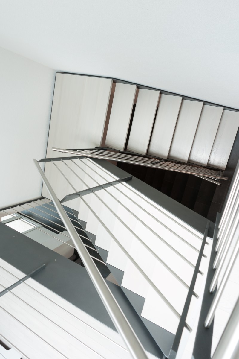 Die Grosszügige zweiläufige Podestwangentreppe passt gut in die moderne Umgebung.