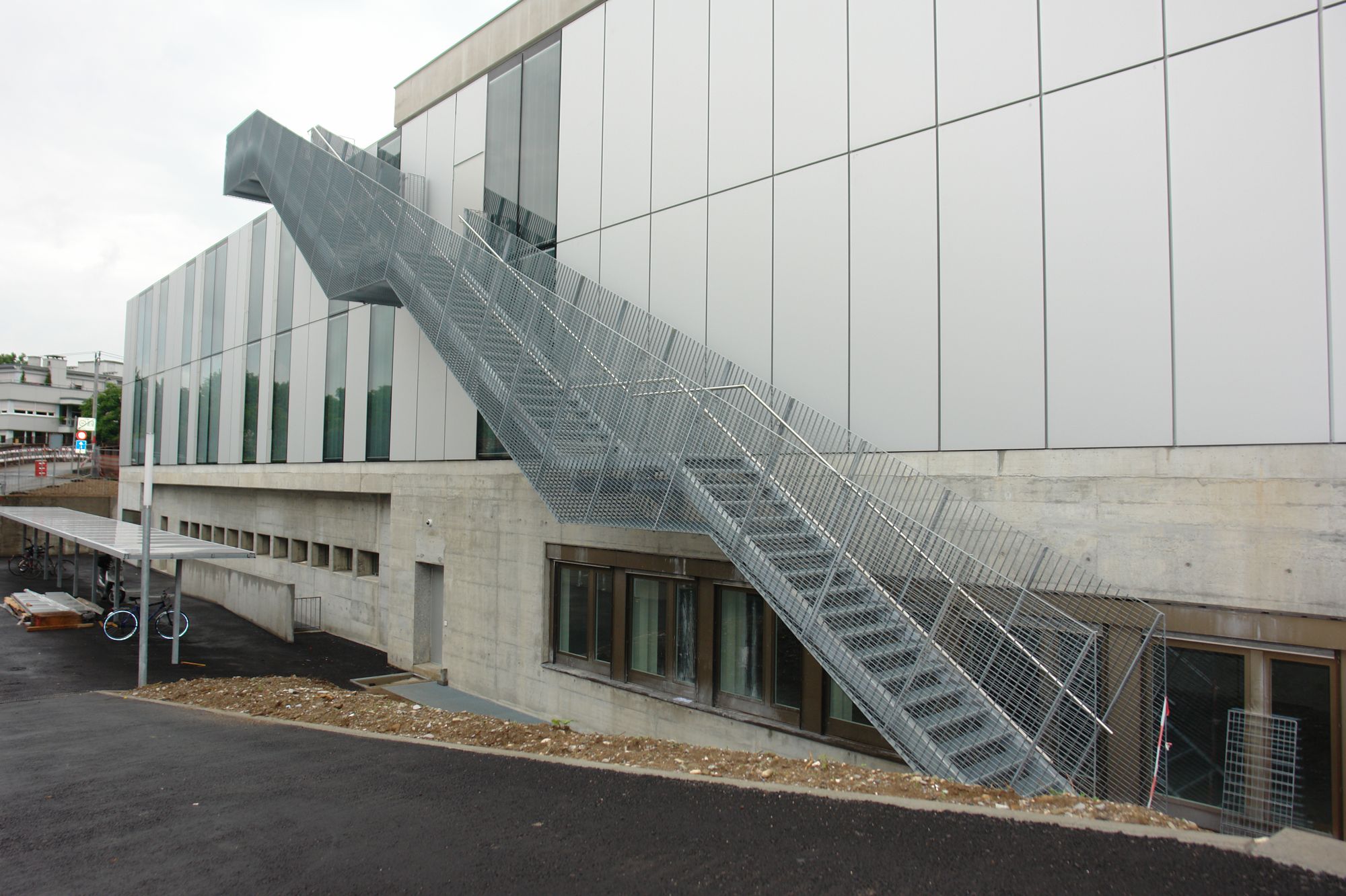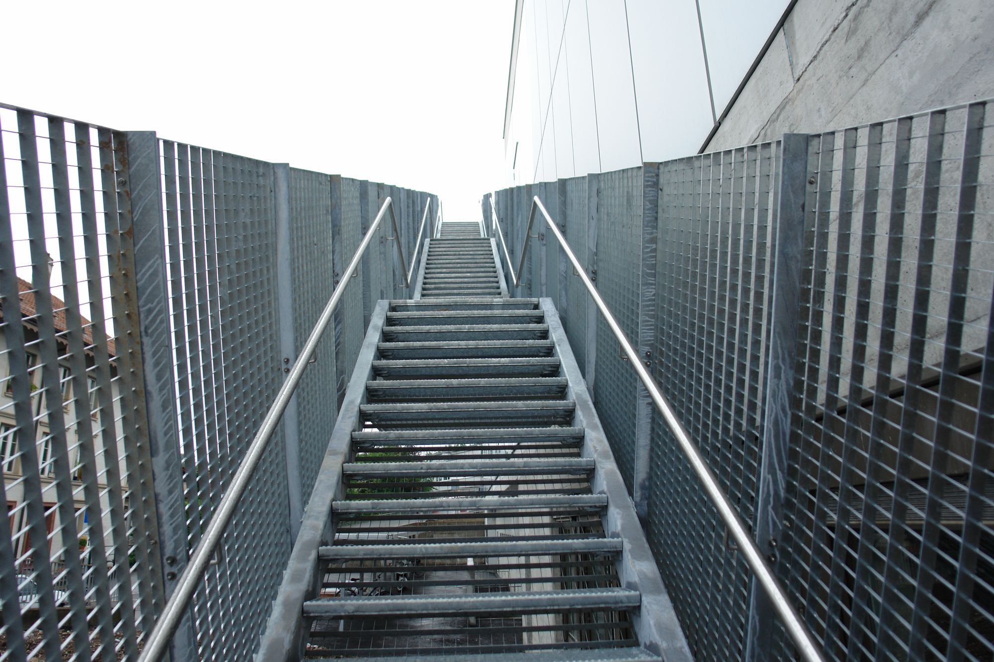 Die Polygontreppe am Wylerpark Bern. Das formgebende Element bei dieser Treppe sind die Gitterroste, die die klassische Wangentreppe interessant einkleiden. Gleichzeitig konnte so sichergestellt werden, dass unbefugte die Treppe nicht ohne weiteres begehen können.
