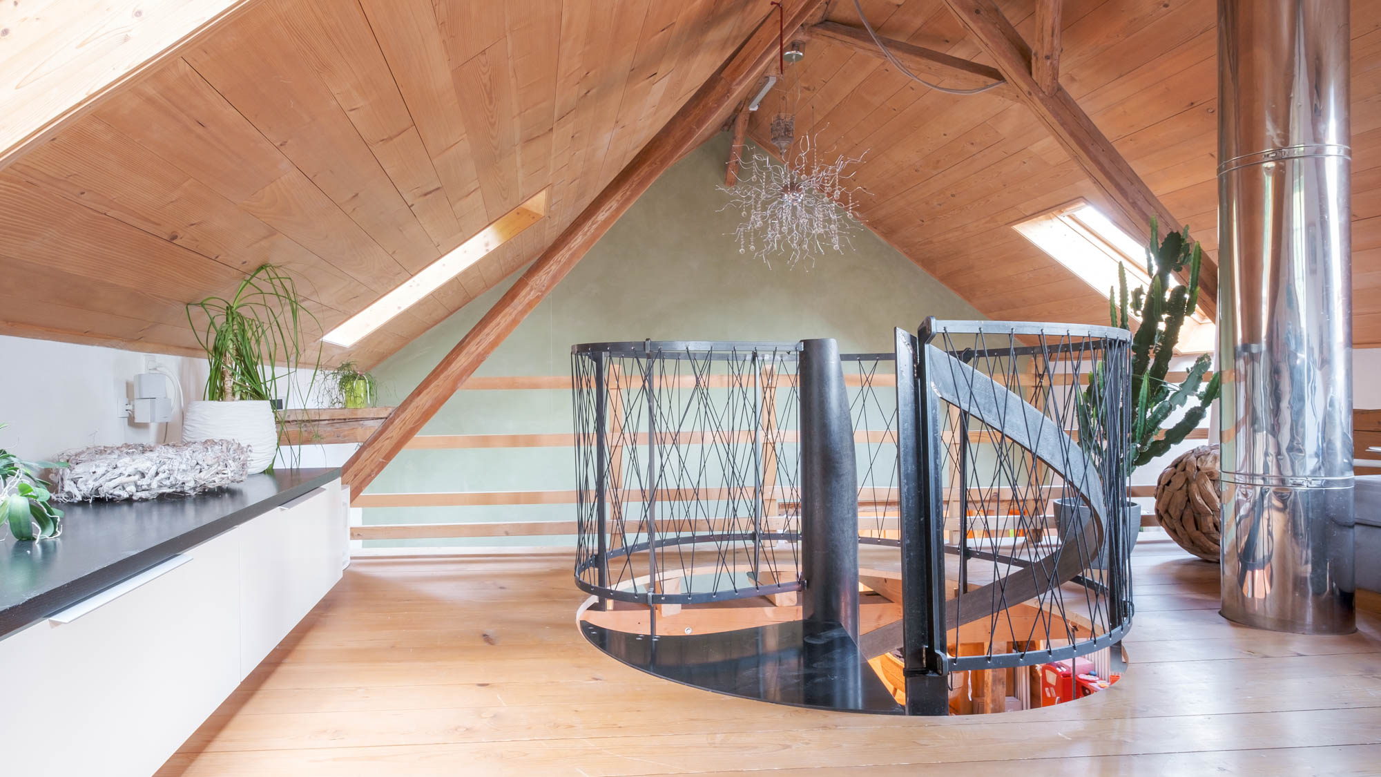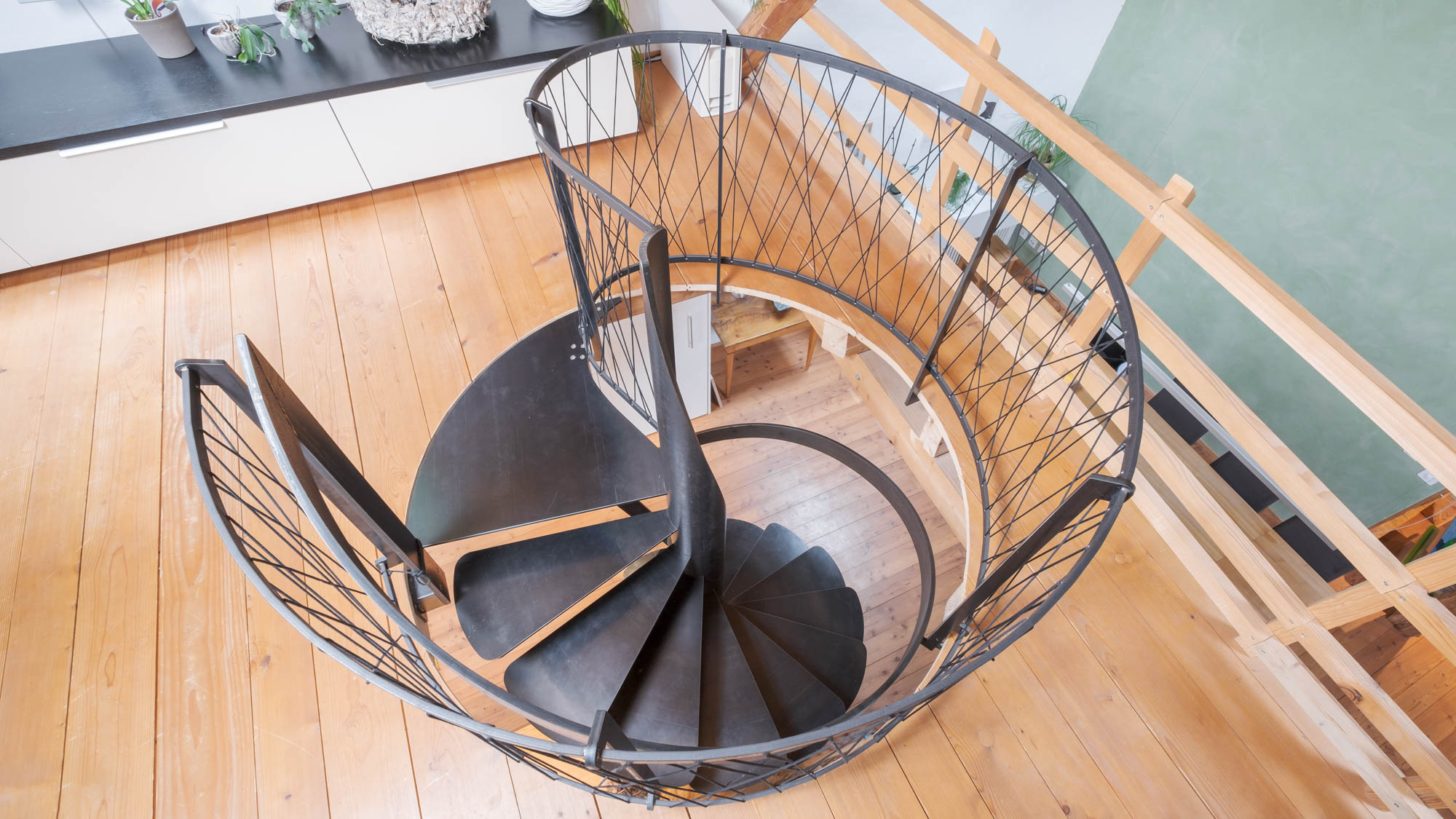 Es war eine Herausforderung, da mitten in der Küche den Platz für eine Treppe zu finden, aber es hat sich gelohnt. Entstanden ist eine freitragende Wendletreppe, die sich wie eine Blume über die Theke windet, ohne wirklich jemandem Platz zu nehmen. Das Rücklaufgeländer mit den wild gespannten Nylonseilen ist eigenständig, aber gibt der Treppe den Raum, den sie verdient.