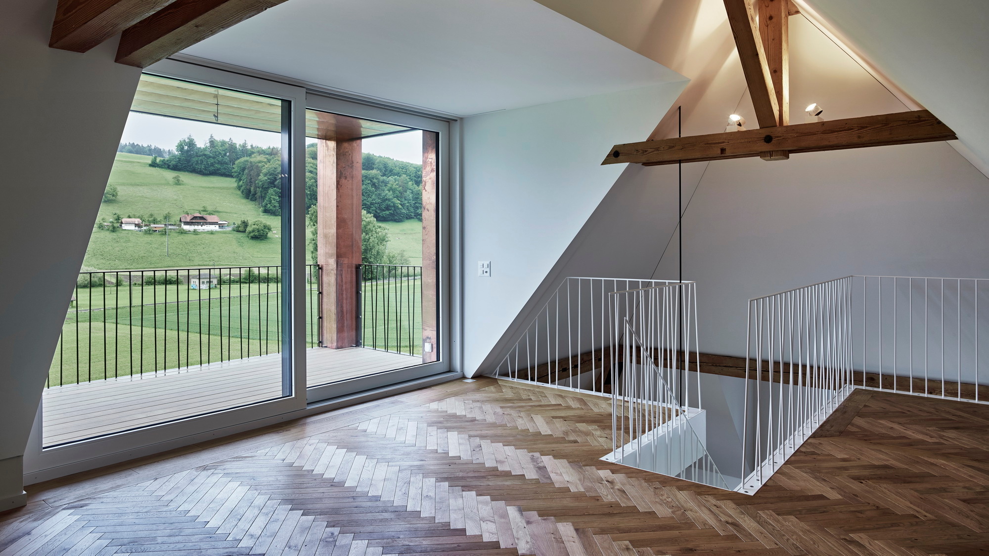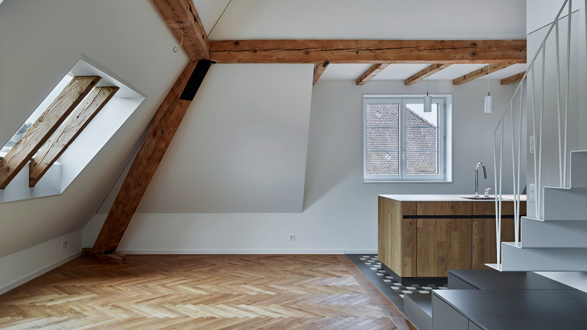 Die Faltwerktreppe ging buchstäblich aus dem Weg, und hat zwei Tritte dem Sideboard abgetreten. Ein Faltwerk lässt sich nicht filigraner bauen als mit Stahlblech. In Weiss und mit den feinst möglichen Staketen ist ein Maximum an Reduktion erreicht und das ohne bei der Sicherheit Abstriche zu machen.